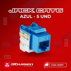 El Jack Cat6 Azul 3BUMEN es un accesorio para montaje de redes estructuradas, diseñado para garantizar una conexión confiable y ordenada en instalaciones de cableado de datos o VozIP. Se presenta en bolsa por 5 unidades y cuenta con certificación de calidad, asegurando desempeño constante y compatibilidad con infraestructuras de red categoría 6. Su color azul permite una identificación rápida de los puntos de red de datos, diferenciándolos de los puntos de VozIP (comúnmente identificados con color rojo).