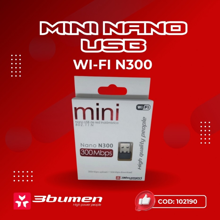 El Mini Nano USB Wi-Fi N300 3BUMEN ofrece una conexión inalámbrica rápida, estable y segura, ideal para computadoras de escritorio o portátiles que requieren conectividad eficiente sin cables.